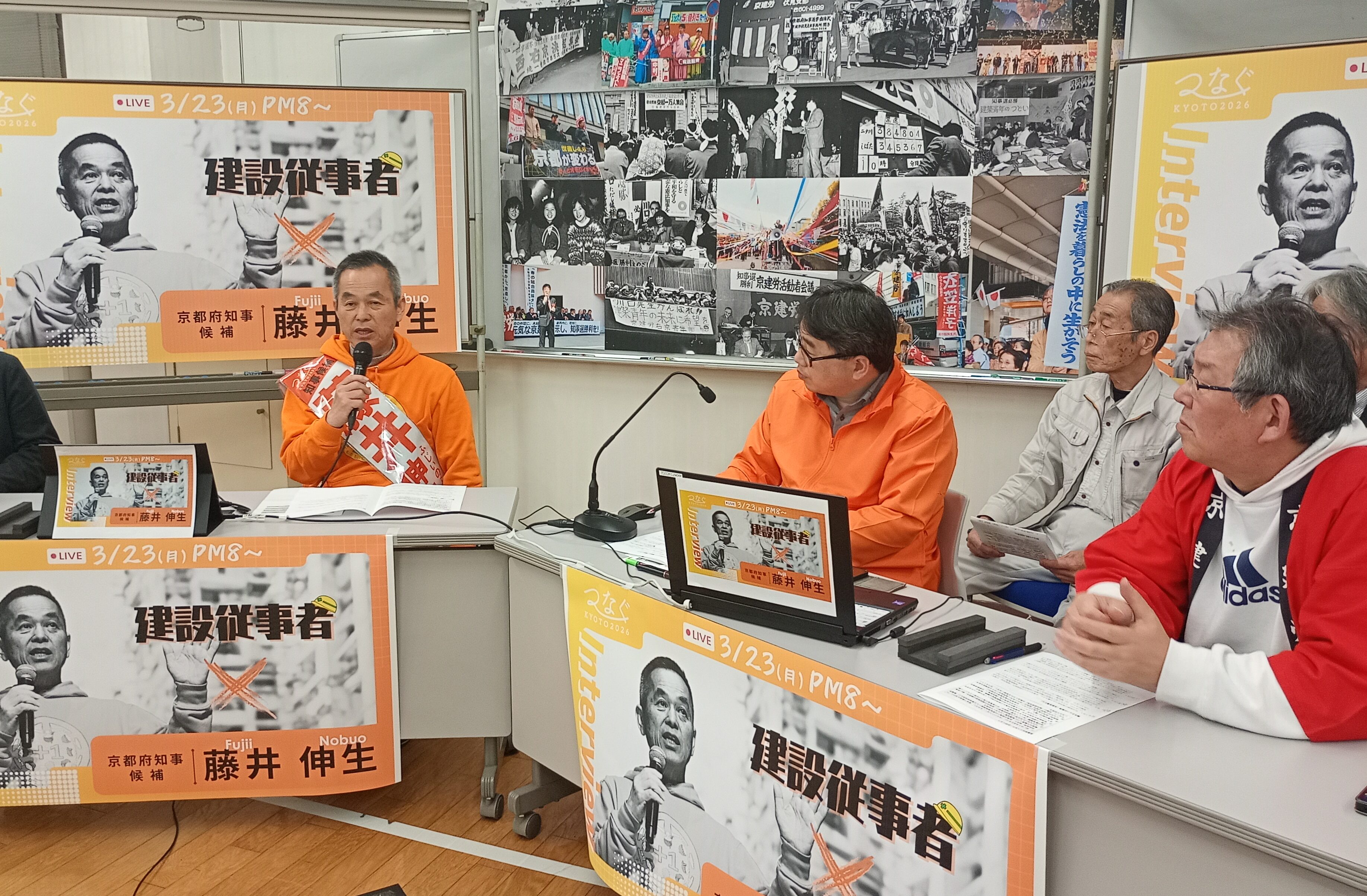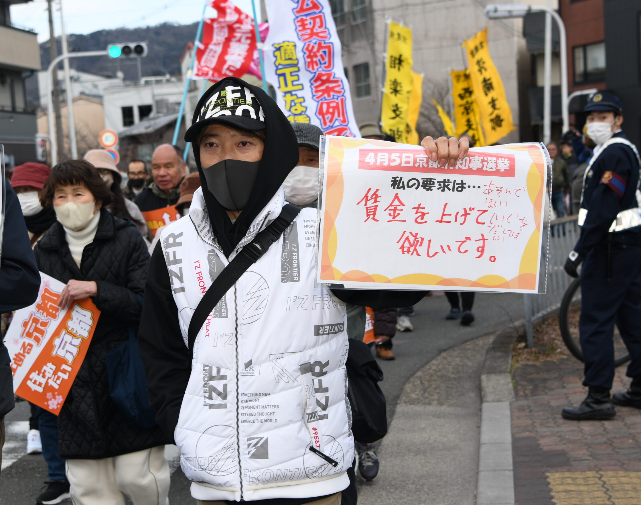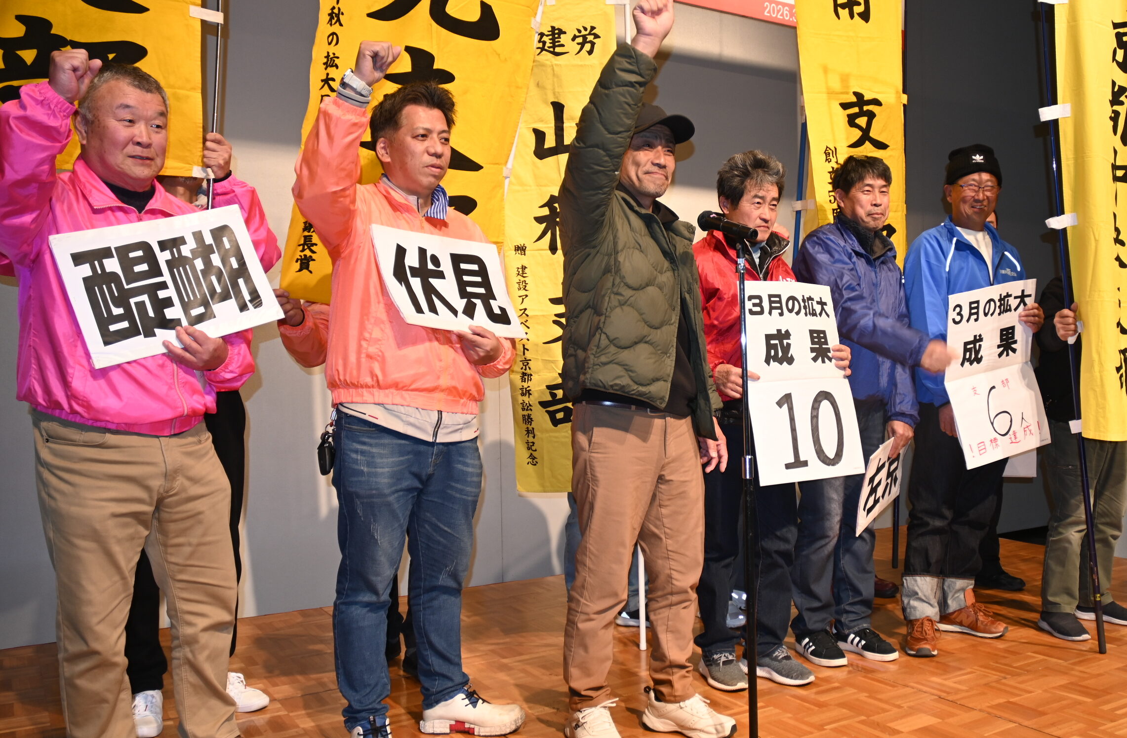 3月15日、左京区のみやこめっせで「3・15京建労春の総決起集会」が行われ、組合員や家族など411人が集まりました。当日は京都府知事候補の藤井伸生さんも駆けつけ連帯のあいさつを行いました。集会終了後は大幅賃上げなど、建設従事者の処遇改善をめざし、各支部で作成したプラカー……