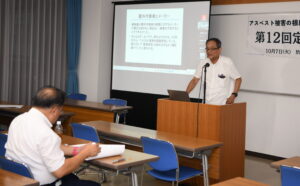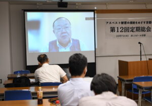 開会にあたって会長の石原一彦さん(立命館大学特別任用教授)は「建設訴訟では最後の山場といえる企業との和解協議に入ったと聞きました。一方で現存する建物にはまだたくさんアスベストが含有されています。除去費用の問題など行政への働きかけなど引き続き努力するべき課題は多いので、これからもともにたたかっていきたいと思います」とあいさつで今後の課題にも触れました。