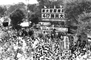 売上税反対の大規模集会が各地で開かれ、国民的反対の意思を示し、その後の統一地方選挙で自民党が大敗北、日本共産党が大躍進。4月23日に売上税の国会通過を断念させました。