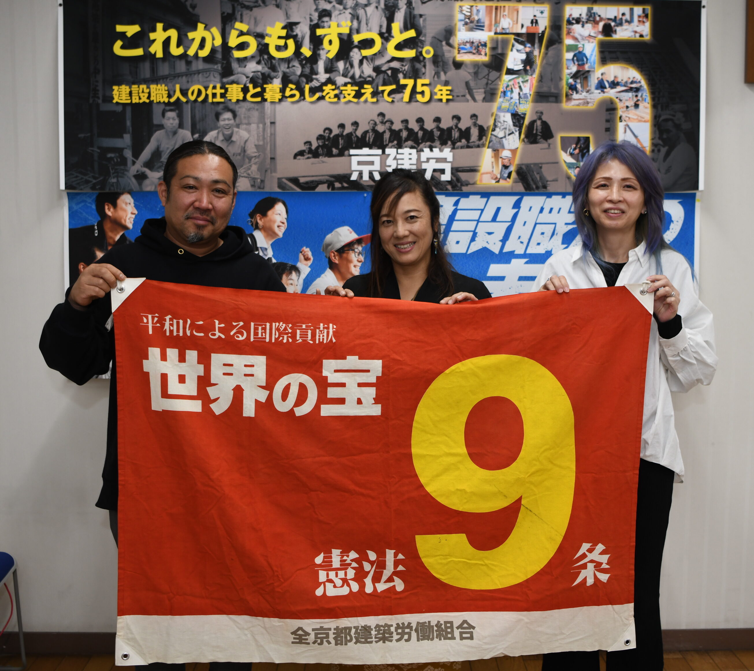 「京建労本部教宣・平和部」の梨子本忠士部長と、「6・9行動」や「赤紙配り」をはじめとする平和活動にとりくみ続ける「京建労主婦・女性の会」の酒井みどり会長、そして2月15日に開催する「京建労75周年フ……