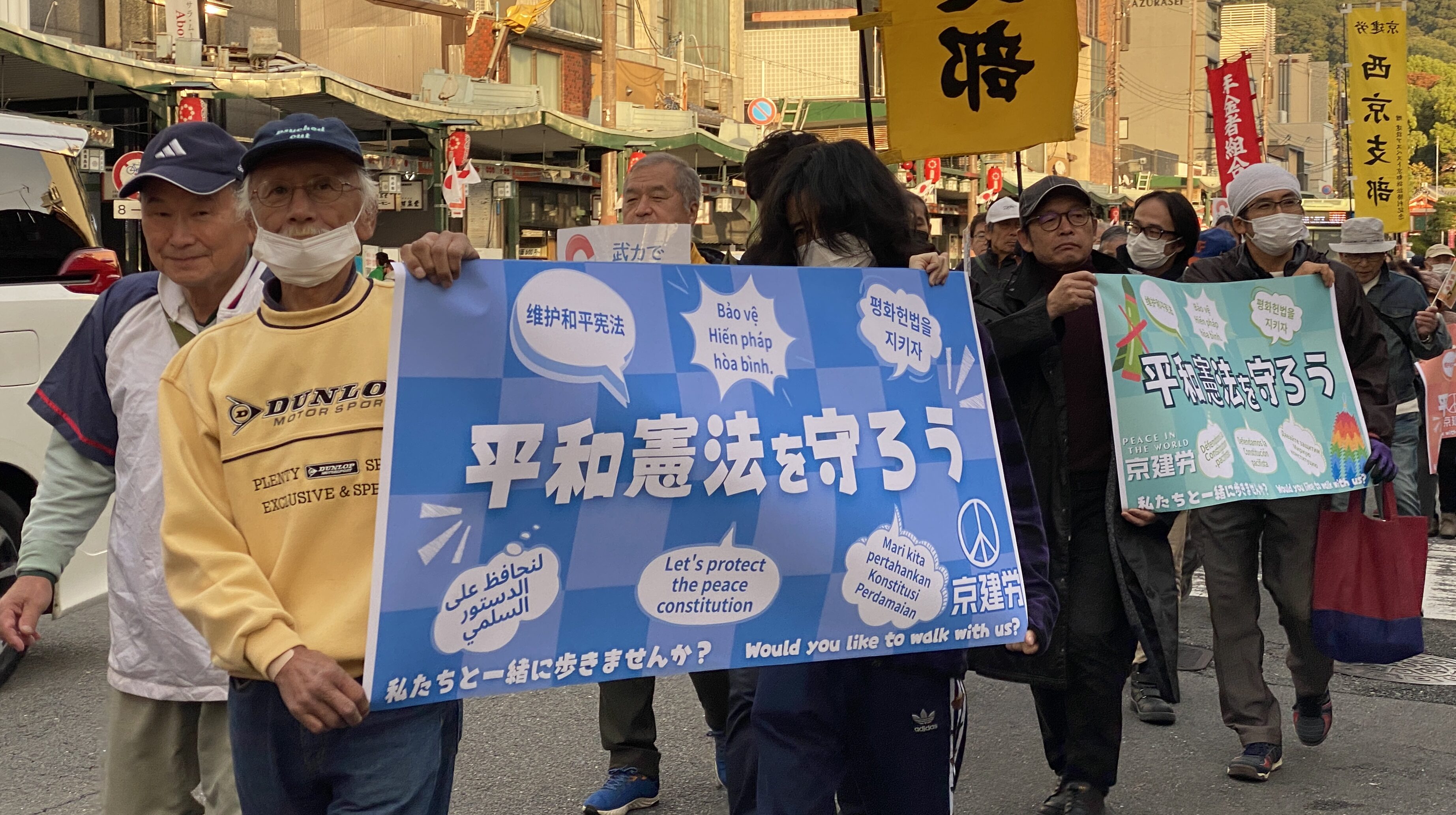 11月3日、京都市東山区の円山公園音楽堂で開催された「生かそう憲法 守ろう9条11・3憲法集会in京都」には、全体で1600人、京建労から206人が参加しました。 急な雨に見舞われた……